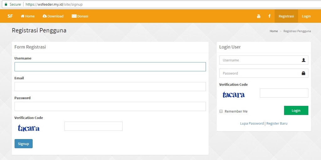 Untuk mendownload WSCFeeder, silahkan buka laman resminya https://wsfeeder.my.id/ kemudian lakukan registrasi terlebih dahulu melalui menu Registrasi di bagian Navigasi Laman. Maka akan muncul tampilan seperti ini: