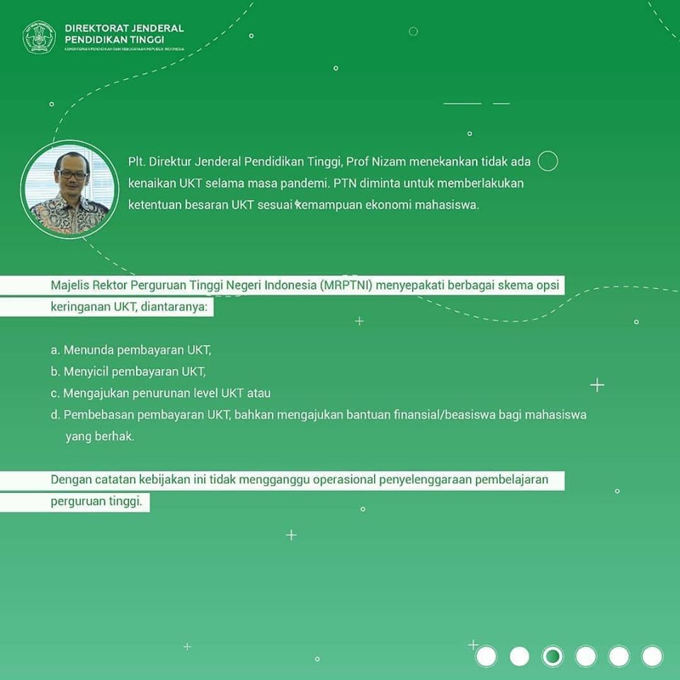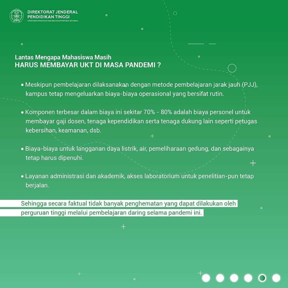 Ditengah pandemi Covid-19 yang mengakibatkan perubahan sistem pembelajaran Perguruan Tinggi Indonesia, cukup banyak #InsanDikti yang mempertanyakan mengenai biaya kuliah yang berlaku. Maka dari itu, yuk simak bersama pemaparan mengenai biaya kuliah Perguruan Tinggi Negeri di Indonesia selama Pandemi-Covid 19!