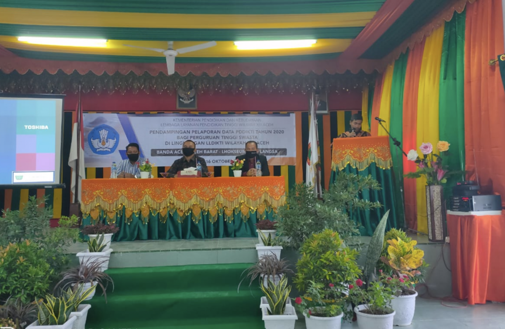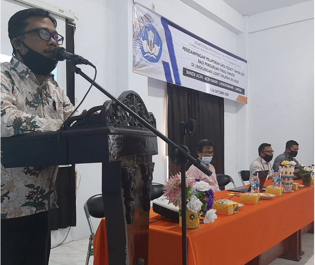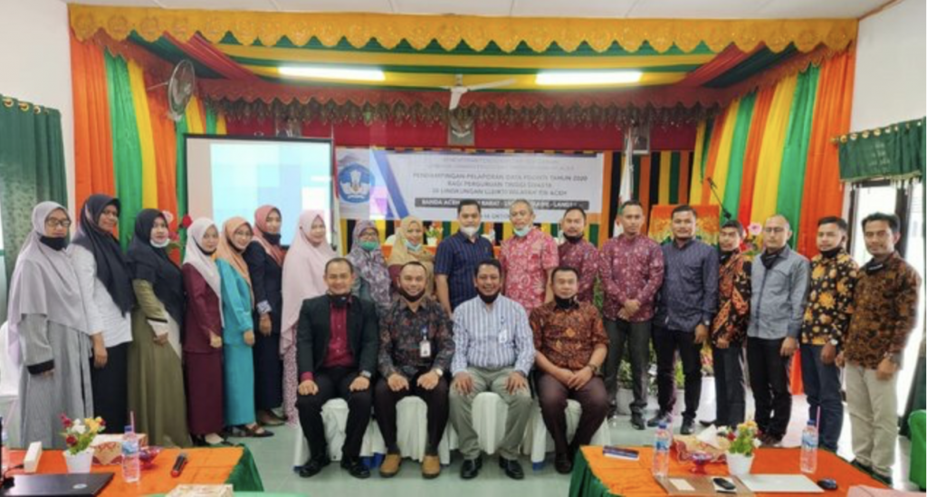 Serangkaian kegiatan Pendampingan Pelaporan Data PDDikti yang dilaksanakan oleh LLDikti Wilayah XIII Aceh telah selesai dilaksanakan (1-16 Oktober 2020). Di Aceh Barat kegiatan ini dilaksanakan di Kampus Bina Bangsa Meulaboh (BBM) yang mengikut sertakan 8 PT (8/10/20). Pada waktu yang bersamaan Pendampingan Pelaporan PDDikti juga dilaksanakan di Lhokseumawe di aula Akademi Keperawatan Iskandar Muda Lhokseumawe dengan menghadirkan 20 PT. Terkahir kegiatan ini dilaksanakan di Universitas Sains Cut Nyak Dhien Langsa yang melibatkan 10 PT (14-15/12/20).