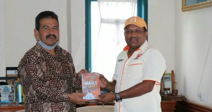 Haji Mukhlis menyerahkan 30 eks buku biografinya yang ditulis oleh alumnus Umuslim Muhajir Juli.