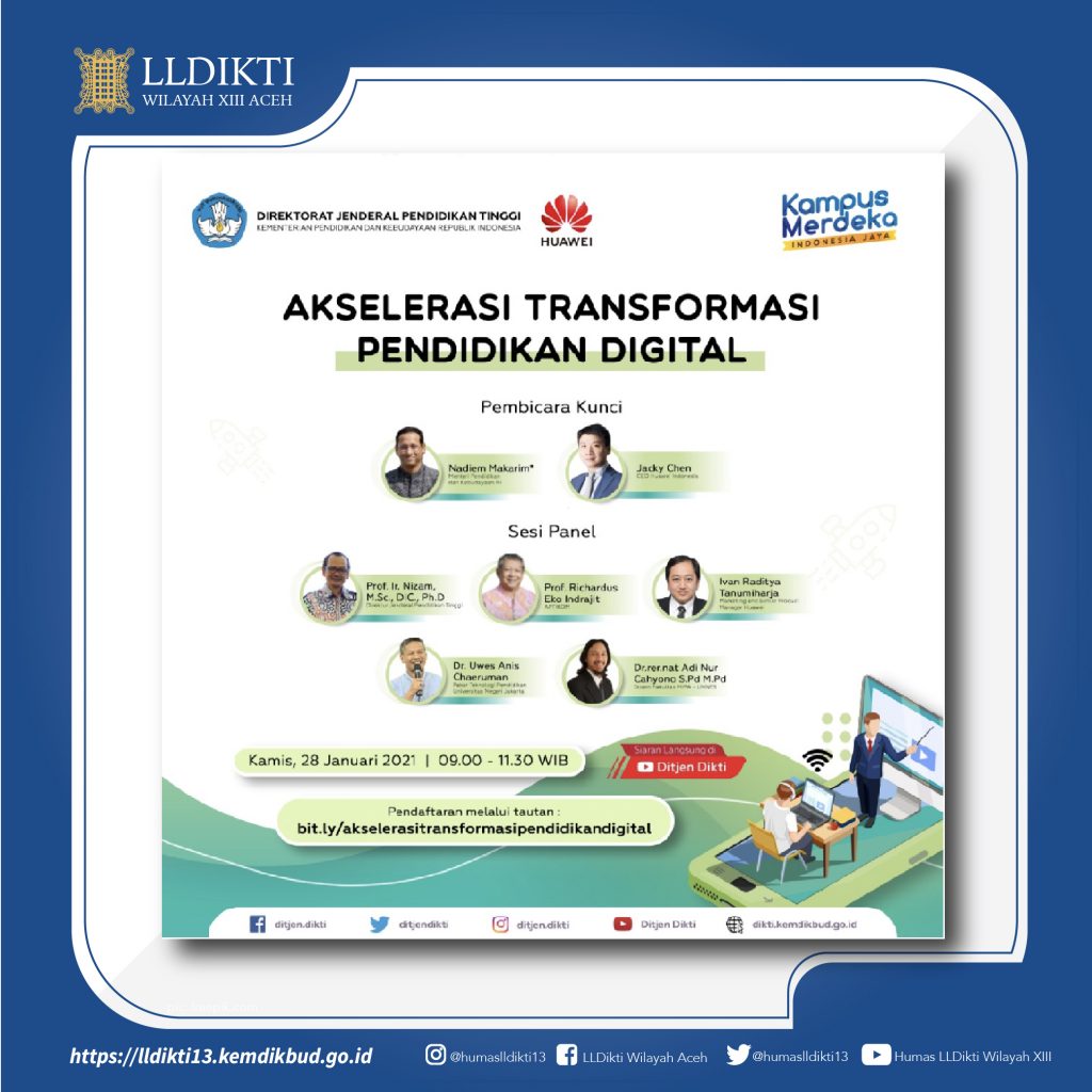 Sehubungan dengan hal tersebut, kami mengharapkan partisipasi para tenaga pendidik dan tenaga kependidikan perguruan tinggi dalam Webinar Akselerasi Transformasi Pendidikan Digital Tahun 2021 melalui platform zoom meeting yang akan diselenggarakan pada Kamis, 28 Januari 2021. Pendaftaran dilakukan melalui tautan http://bit.ly/akselerasitransformasipendidikandigital. Bila diperlukan informasi lebih lanjut dapat menghubungi Andy di nomor 0852-6827-1692/ Anisa di nomor 0812-4084-1745.