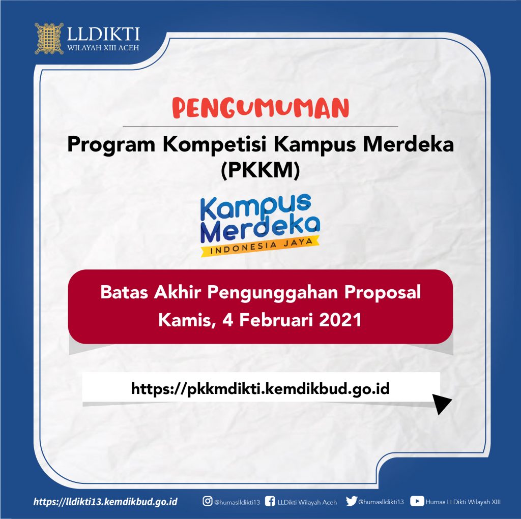 mengunggah proposal selambatnya padaKamis, 4 Februari 2021 melalui laman https://pkkmdikti.kemdikbud.go.id.