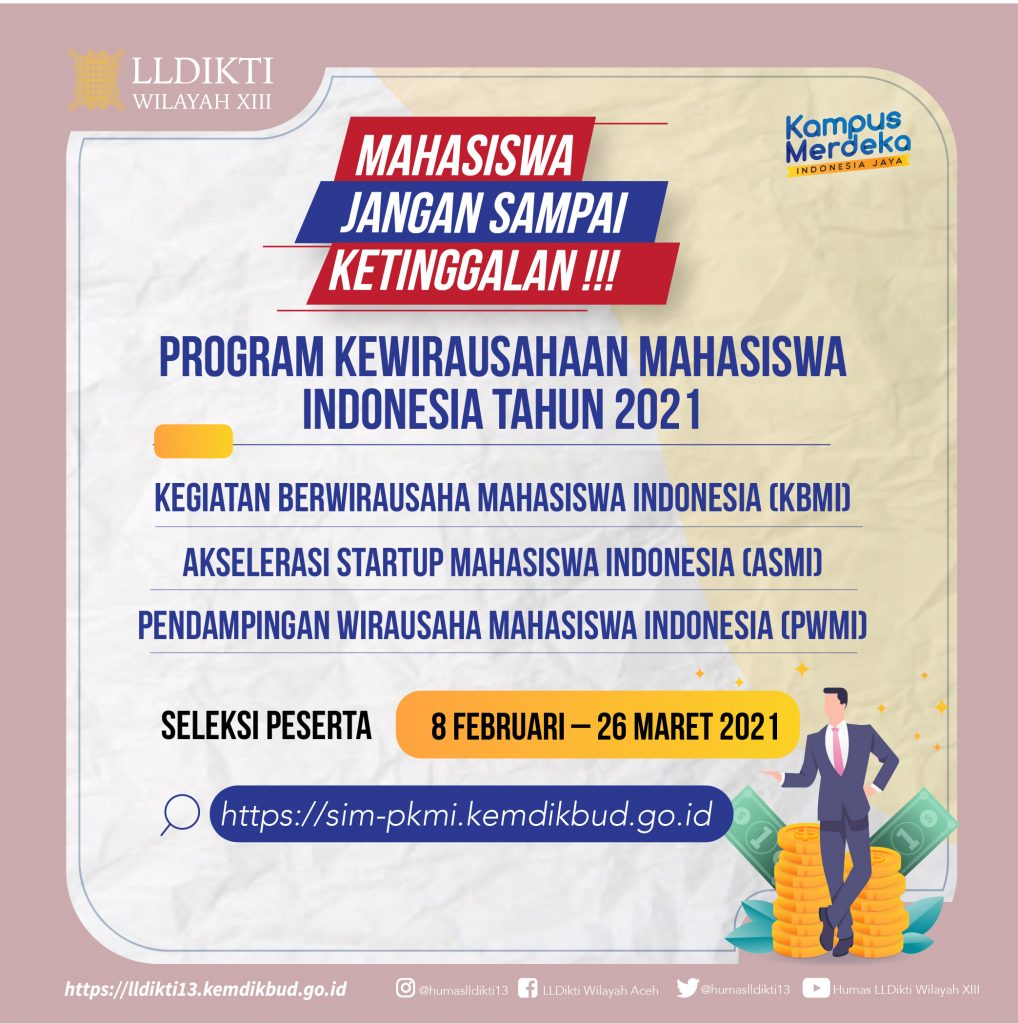 Menindaklanjuti surat Direktur Pembelajaran dan Kemahasiswaan Direktorat Jenderal Pendidikan Tinggi Kementerian Pendidikan dan Kebudayaan Nomor 0521/E2/KM/2021 tanggal 7 Februari 2021 perihal Tawaran Program Kewirausahaan Mahasiswa Indonesia 2021, maka kami sampaikan bahwa pelaksanaan Program Kewirausahaan Mahasiswa Indonesia (PKMI) terdiri dari Kegiatan Berwirausaha Mahasiswa Indonesia (KBMI), Akselerasi Startup Mahasiswa Indonesia (ASMI) dan Pendampingan Wirausaha Mahasiswa Indonesia (PWMI) Tahun 2021 merupakan bentuk implementasi kebijakan Merdeka Belajar-Kampus Merdeka (MBKM). Seleksi peserta mulai dari tanggal 8 Februari – 26 Maret 2021 melalui tautan https://sim-pkmi.kemdikbud.go.id.