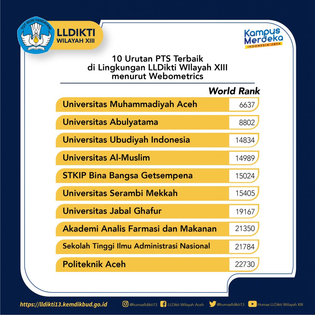 Merujuk pada website webometrics berikut pemeringkatan 10 kampus swasta terbaik di lingkungan LLDikti Wilayah XIII tahun 2021.