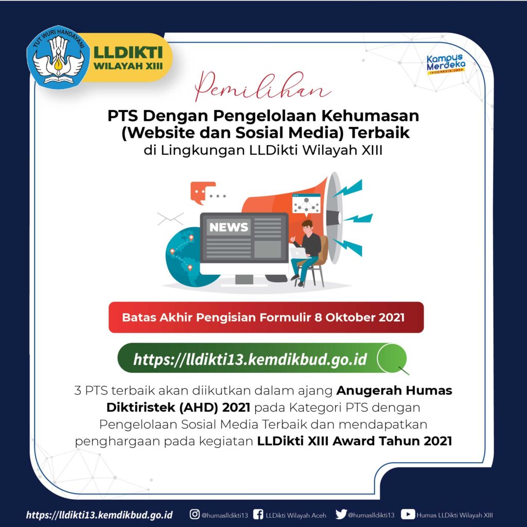 Sehubungan dengan adanya Anugerah Humas Diktiristek 2021 yang diselenggarakan oleh Direktorat Jenderal Pendidikan Tinggi, Riset, dan Teknologi, maka dengan ini LLDikti Wilayah XIII akan menyeleksi tiga perguruan tinggi swasta terbaik bidang humas untuk mengikuti Anugerah Humas Diktiristek tingkat nasional.