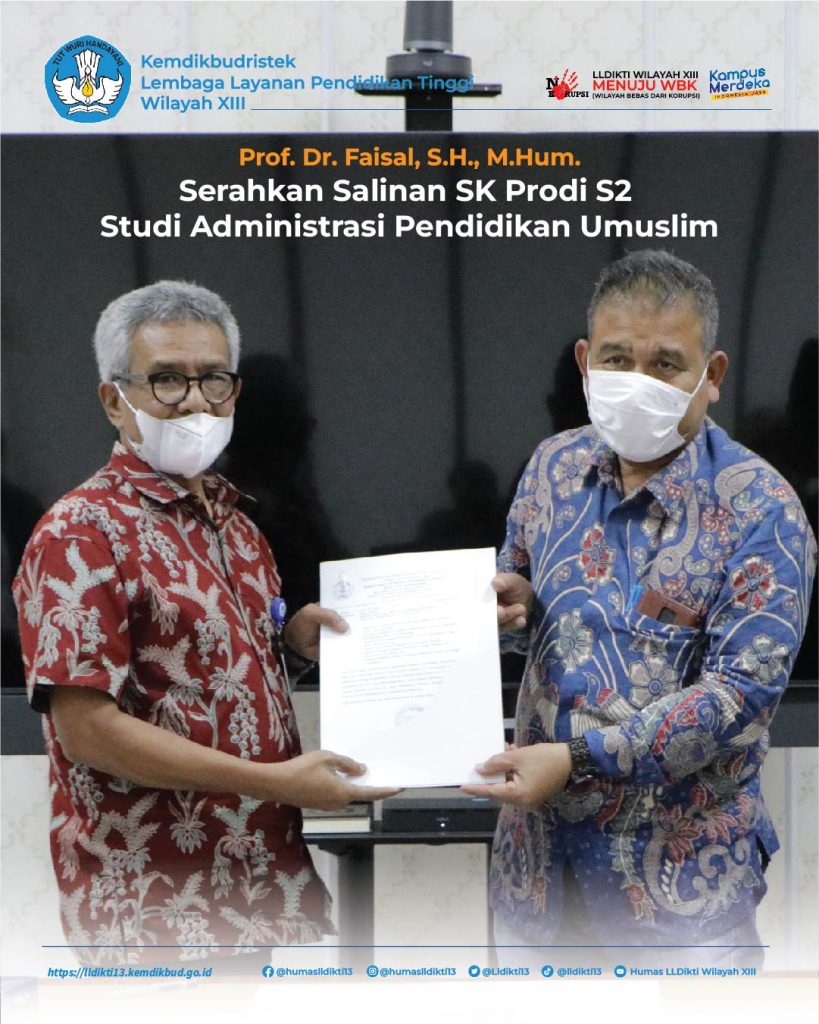 Banda Aceh (1/3/2022) Plt. Kepala LLDikti Wilayah XIII Prof. Dr. Faisal, S.H. M.Hum menyerahkan Salinan SK Menteri Pendidikan, Kebudayaan, Riset, dan Teknologi, Nomor 78/E/O/2022 tentang Izin Pembukaan Program Studi Administrasi Pendidikan Program Magister Pada Universitas Almuslim kepada Rektor Umuslim Dr. Marwan, M.Pd.