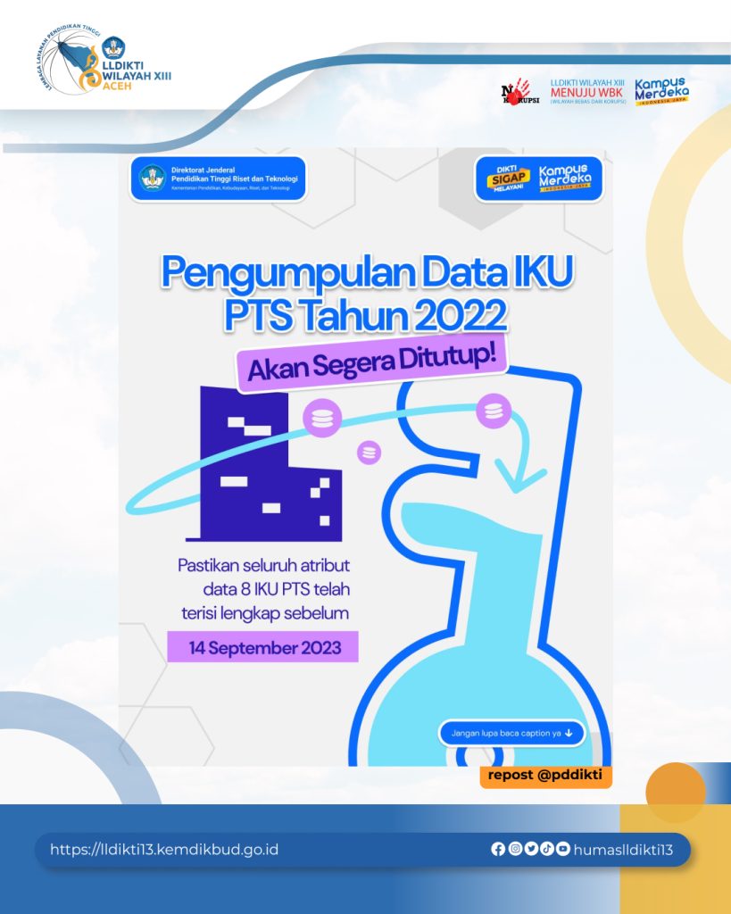 Sehubungan dengan hal tersebut, kami imbau PTS untuk dapat mengisi dan melengkapi seluruh atribut data yang dibutuhkan pada masing-masing IKU melalui Pangkalan Data Pendidikan Tinggi (PDDikti) dan sumber data terkait paling lambat tanggal 14 September 2023. Hasil capaian IKU dapat dilihat pada laman https://iku-pt.kemdikbud.go.id/.