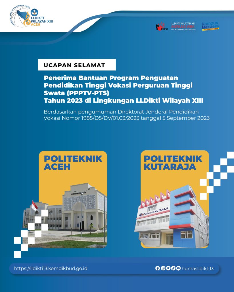 Sehubungan dengan telah dilaksanakannya evaluasi terhadap proposal Program Penguatan Pendidikan Tinggi Vokasi – Perguruan Tinggi Swasta (PPPTV-PTS) Tahun Anggaran 2023, bersama ini Direktur Kelembagaan dan Sumber Daya Pendidikan Tinggi Vokasi menyatakan nama-nama Badan Penyelenggara dan Perguruan Tinggi Swasta sebagaimana terlampir di bawah ini sebagai Penerima bantuan PPPTV-PTS Tahun 2023: