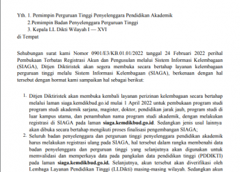 Ditjen Diktiristek akan membuka kembali layanan perizinan kelembagaan secara bertahapmelalui laman siaga.kemdikbud.go.id mulai 1 April 2022 untuk pembukaan program studiprogram…